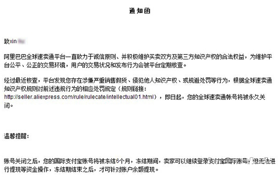 根據速賣通賣家韓女士的表示:最近很多賣家都有收到來自速賣通平臺發來關閉賬戶、凍結國際支付寶賬號的通知。通知的內容大概是這樣描述的,經過速賣通平臺的審查,發現你的店鋪存在售假行為,將會受到相應的處罰,從即日起,你的全球速賣通賬號將永久被關閉,國際支付寶賬號還將被凍結六個月,期間不能進行任何操作。處罰上所說的關閉賬戶就等于刪除賬戶、下架店鋪內所有出售中的商品、禁止發布商品,并禁止創建店鋪。