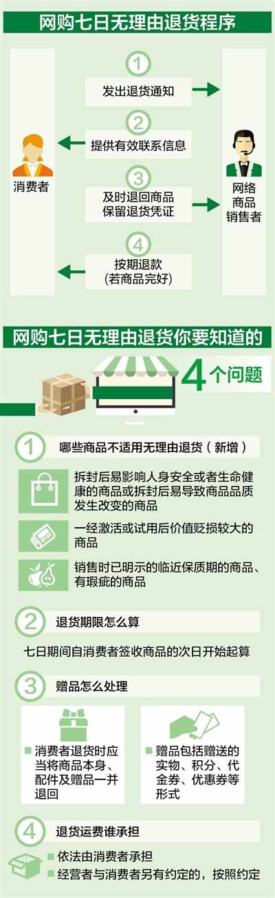 據人民日報報道,辦法主要包括以下四點:1)七日自簽收的次日開始算;2)退貨應將贈品一并退回;3)退貨運費由消費者承擔;4)定作商品等四類不適用無理由退貨。