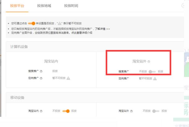 11、計算機設備中的淘寶站外,搜索推廣可以設置投放或者不投放,向右邊滑動就是投放,向左邊滑動就是不投放