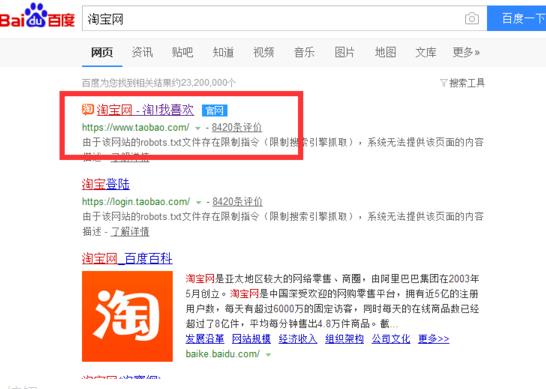 1、截止到2019年,直通車的計算機端淘寶站內搜索不能關閉。打開一個瀏覽器,在百度中輸入“淘寶網”,單擊“百度一下”