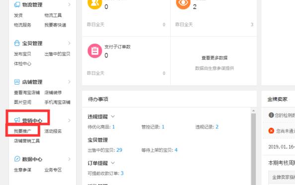 5、在打開的賣家中心頁面中,找到“營銷中心”選項下的“我要推廣”選項