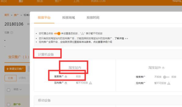 10、在出現的界面中,在“投放平臺”下看到計算機設備,看到“淘寶站內”的搜索推廣默認是“投放”的狀態,并且是無法修改的