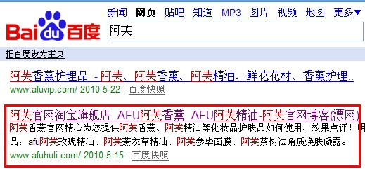 因為淘寶網屏蔽了百度的蜘蛛,所以也就留出了很多的流量給淘寶客們,這部分流量除了淘寶相關的關鍵字外,就是產品名稱的關鍵和網店品牌名的關鍵字,所以一些大品牌的,比如阿芙,飄飄龍,本身就有很多的客戶,很多客戶都是直接在百度找他們,你的博客在流量競爭中就非常具有優勢,博客進行了基本的SEO設置,具體SEO的方法可以參考之前分享的SEO五步走進行。阿芙的博客和飄飄龍的博客在百度的排名都是很高的,關鍵是這些流量轉化為客戶的轉化率也很高。
