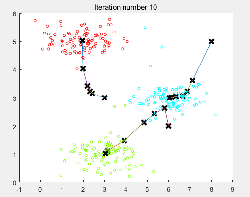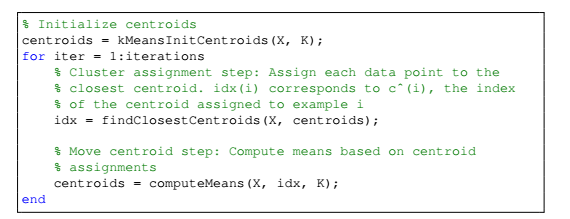 for i = 1:mcentroids(idx(i),:) = centroids(idx(i),:) + X(i,:);endfor j = 1:Kcentroids(j,:) = centroids(j,:)/sum(idx == j);end
