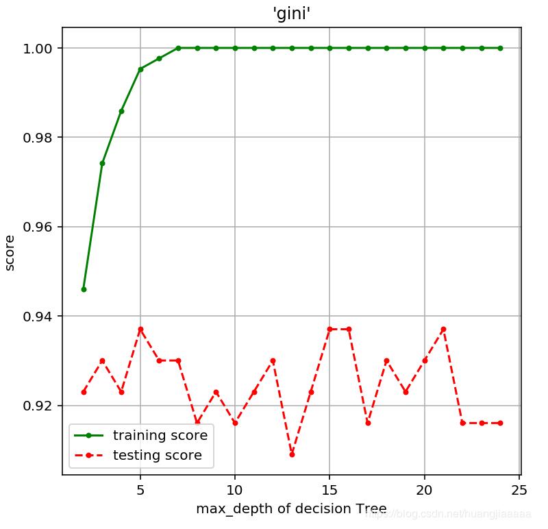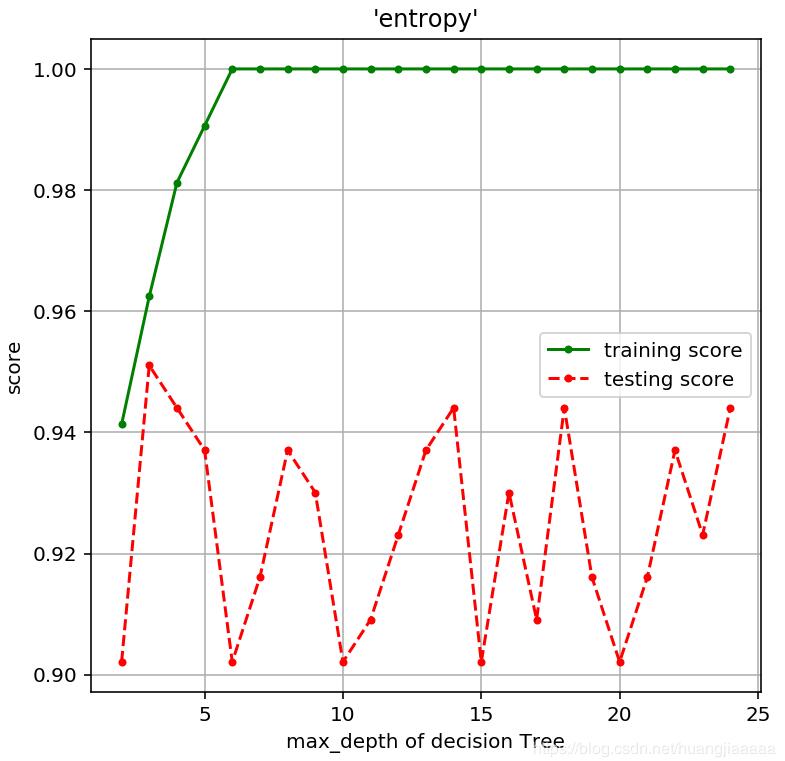 # -*- coding: utf-8 -*-"""Created on Sat Nov 9 10:42:38 2019@author: asus""""""決策樹目的:1. 使用決策樹模型2. 了解決策樹模型的參數3. 初步了解調參數要求:基于乳腺癌數據集完成以下任務:1.調整參數criterion,使用不同算法信息熵(entropy)和基尼不純度算法(gini)2.調整max_depth參數值,查看不同的精度3.根據參數criterion和max_depth得出你初步的結論。"""import matplotlib.pyplot as pltimport numpy as npimport pandas as pdimport mglearn from sklearn.model_selection import train_test_split#導入乳腺癌數據集from sklearn.datasets import load_breast_cancerfrom sklearn.tree import DecisionTreeClassifier#決策樹并非深度越大越好,考慮過擬合的問題#mglearn.plots.plot_animal_tree()#mglearn.plots.plot_tree_progressive()#獲取數據集cancer = load_breast_cancer()#對數據集進行切片X_train,X_test,y_train,y_test = train_test_split(cancer.data,cancer.target, stratify = cancer.target,random_state = 42)#查看訓練集和測試集數據 print('train dataset :{0} ;test dataset :{1}'.format(X_train.shape,X_test.shape))#建立模型(基尼不純度算法(gini)),使用不同最大深度和隨機狀態和不同的算法看模型評分tree = DecisionTreeClassifier(random_state = 0,criterion = 'gini',max_depth = 5)#訓練模型tree.fit(X_train,y_train)#評估模型print("Accuracy(準確性) on training set: {:.3f}".format(tree.score(X_train, y_train)))print("Accuracy(準確性) on test set: {:.3f}".format(tree.score(X_test, y_test)))print(tree)# 參數選擇 max_depth,算法選擇基尼不純度算法(gini) or 信息熵(entropy)def Tree_score(depth = 3,criterion = 'entropy'): """ 參數為max_depth(默認為3)和criterion(默認為信息熵entropy), 函數返回模型的訓練精度和測試精度 """ tree = DecisionTreeClassifier(criterion = criterion,max_depth = depth) tree.fit(X_train,y_train) train_score = tree.score(X_train, y_train) test_score = tree.score(X_test, y_test) return (train_score,test_score)#gini算法,深度對模型精度的影響depths = range(2,25)#考慮到數據集有30個屬性scores = [Tree_score(d,'gini') for d in depths]train_scores = [s[0] for s in scores]test_scores = [s[1] for s in scores]plt.figure(figsize = (6,6),dpi = 144)plt.grid()plt.xlabel("max_depth of decision Tree")plt.ylabel("score")plt.title("'gini'")plt.plot(depths,train_scores,'.g-',label = 'training score')plt.plot(depths,test_scores,'.r--',label = 'testing score')plt.legend()#信息熵(entropy),深度對模型精度的影響scores = [Tree_score(d) for d in depths]train_scores = [s[0] for s in scores]test_scores = [s[1] for s in scores]plt.figure(figsize = (6,6),dpi = 144)plt.grid()plt.xlabel("max_depth of decision Tree")plt.ylabel("score")plt.title("'entropy'")plt.plot(depths,train_scores,'.g-',label = 'training score')plt.plot(depths,test_scores,'.r--',label = 'testing score')plt.legend()運行結果: