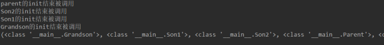 class Parent(object): def __init__(self, name): self.name = name print('parent的init結(jié)束被調(diào)用')class Son1(Parent): def __init__(self, name, age): Parent.__init__(self, name) self.age = age print('Son1的init結(jié)束被調(diào)用')class Son2(Parent): def __init__(self, name, gender): Parent.__init__(self, name) self.gender = gender print('Son2的init結(jié)束被調(diào)用')class Grandson(Son1, Son2): def __init__(self, name, age, gender): Son1.__init__(self, name, age) # 單獨(dú)調(diào)用父類的初始化方法 Son2.__init__(self, name, gender) print('Grandson的init結(jié)束被調(diào)用')gs = Grandson('grandson', 12, '男')執(zhí)行結(jié)果: