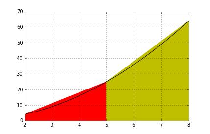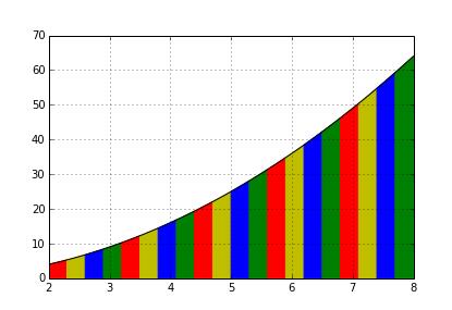 if __name__ == "__main__": func = lambda x: x**2 a, b = 2, 8 n = 20 print integral(a, b, n, func) ''' 畫圖 ''' import matplotlib.pyplot as plt plt.figure("play") ax1 = plt.subplot(111) plt.sca(ax1) tmpx = [2 + float(8-2) /50 * each for each in range(50+1)] plt.plot(tmpx, [func(each) for each in tmpx], linestyle = '-', color='black') for rang in range(n): tmpx = [a + float(8-2)/n * rang, a + float(8-2)/n * rang, a + float(8-2)/n * (rang+1), a + float(8-2)/n * (rang+1)] tmpy = [0, func(tmpx[1]), func(tmpx[2]), 0] c = ['r', 'y', 'b', 'g'] plt.fill(tmpx, tmpy, color=c[rang%4]) plt.grid(True) plt.show()