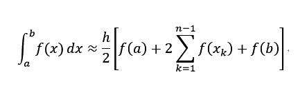 """@brief: 求func積分 : @param: a 積分區間左端點@param: b 積分區間右端點@param: n 積分分為n等份(復化梯形求積分要求)@param: func 求積函數@return: 積分值""" def integral(a, b, n, func): h = (b - a)/float(n) xk = [a + i*h for i in range(1, n)] return h/2 * (func(a) + 2 * sum_fun_xk(xk, func) + func(b))