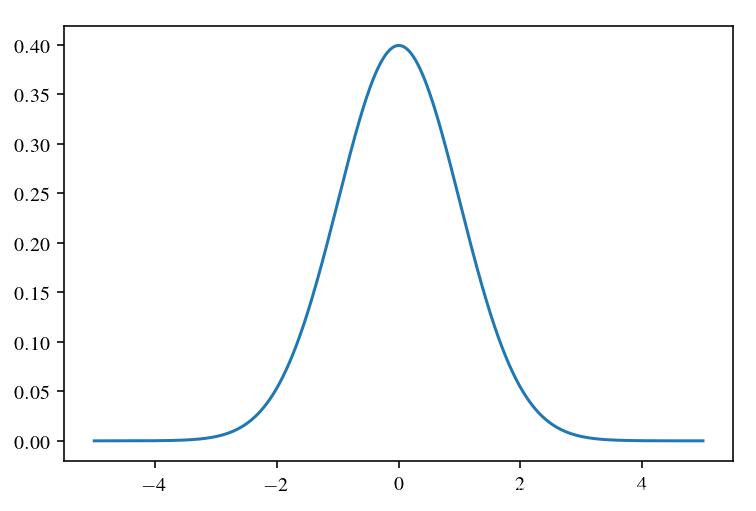 # 繪制概率密度分布圖x = np.arange(-5, 5, 0.001)# PDF是概率密度函數y = stats.norm.pdf(x, loc=mean, scale=std)plt.plot(x, y)plt.show()