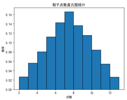 plt.hist(roll_list, bins=range(2,14),normed=1,edgecolor='black',linewidth=1) #normed是歸一化,求頻率。設置邊界顏色及寬度plt.title('骰子點數直方圖統計')plt.xlabel('點數')plt.ylabel('概率')plt.show()但是運行結果如圖1