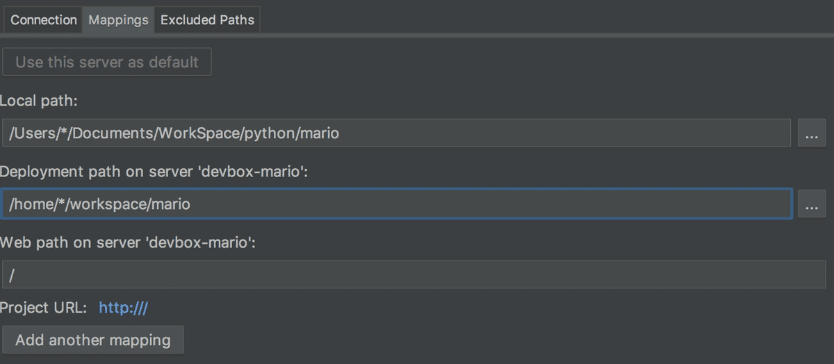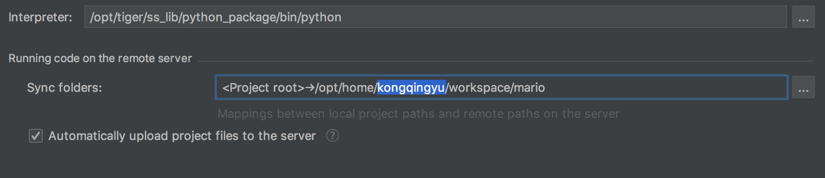 Interpreter:在下一步中選擇對應的python執行器,由于頭條真對MySQLdb等做了服務發現等相關的修改,該修改后的架包放置于:/opt/tiger/ss_lib/python_package/bin/python 下,因此,可以選擇該Python執行器作為Interpreter 或者生成自己的envSync folders: 選擇自己在服務器中存放源碼的目錄