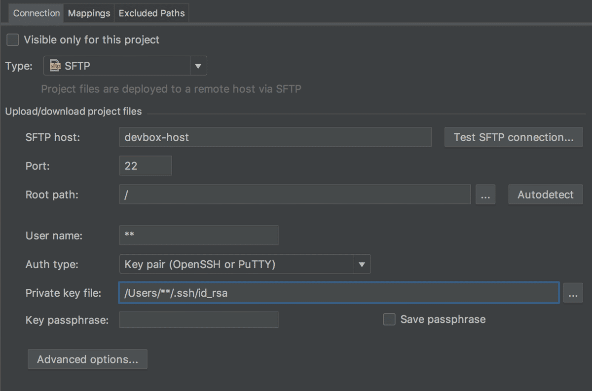 path:源碼上傳到服務器時的目錄因為在Configuration 中我們已經配置了Root path,因此,此處的Deloyment path 選擇相對的根目錄即可配置自動上傳