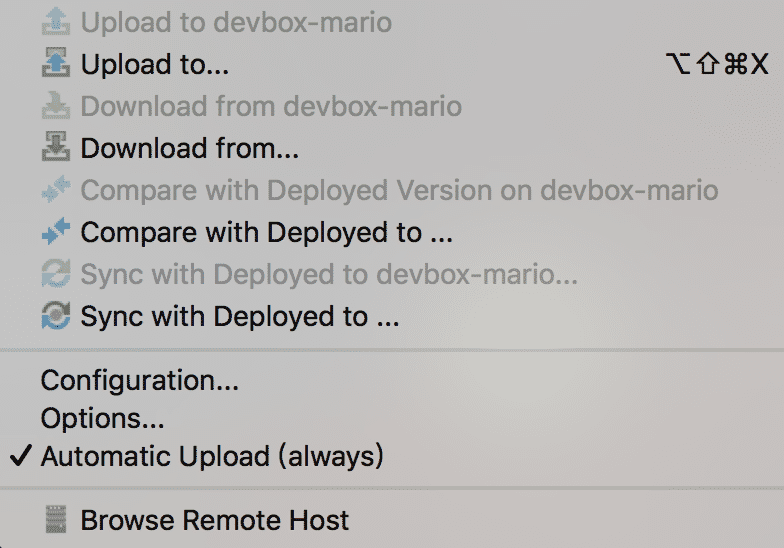 Tools -> Deployment -> Automatic Upload(always) 即可自動將修改的代碼上傳至服務器中