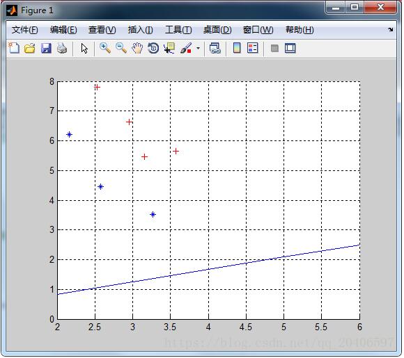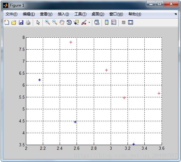 %這是訓練數(shù)據集%2.9500 6.6300 0%2.5300 7.7900 0%3.5700 5.6500 0%3.1600 5.4700 0%2.5800 4.4600 1%2.1600 6.2200 1%3.2700 3.5200 1X=load('22.txt');pos0=find(X(:,3)==0);pos1=find(X(:,3)==1);X1=X(pos0,1:2);X2=X(pos1,1:2);hold onplot(X1(:,1),X1(:,2),'r+','markerfacecolor', [ 1, 0, 0 ]);plot(X2(:,1),X2(:,2),'b*','markerfacecolor', [ 0, 0, 1 ]);grid on%輸出樣本的二維分布
