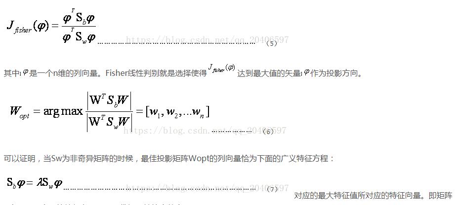 (d)LDA作為一個分類的算法,我們希望類內的聚合度高,即類內散度矩陣小,而類間散度矩陣大。這樣的分類效果才好。因此引入Fisher鑒別準則表達式: