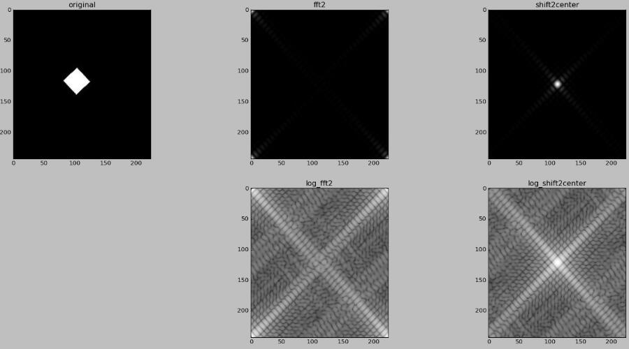 另外,圖像變換的原點需要移動到頻域矩形的中心,所以要對fft2的結果使用fftshift函數。最后也可以使用log來改善可視化效果。