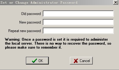 然后會(huì)出現(xiàn)如圖7的界面。因?yàn)槭堑谝淮问褂茫允菦](méi)有密碼的,也就是說(shuō)原來(lái)的密碼為空。不用在old password里輸入字符,直接在下面的New password和Repeat new password里輸入同樣的密碼再點(diǎn)OK就可以了。這里建議設(shè)置一個(gè)足夠復(fù)雜的密碼,以防止別人暴力破解。自己記不得也沒(méi)有關(guān)系,只要把ServUDaemon.ini里的LocalSetupPassword=這一行清除并保存,再次運(yùn)行ServUAdmin.exe就不會(huì)提示你輸入密碼登錄了。