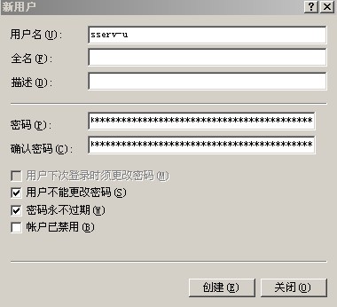 下面就到了該對(duì)SERV-U進(jìn)行安全設(shè)置的時(shí)候了。首先建立一個(gè)WINDOWS賬號(hào)SSERVU,密碼也需要足夠的復(fù)雜。密碼要記住,如果記不住就暫時(shí)保存在一個(gè)文件里,一會(huì)兒還要用到。(見(jiàn)圖8)
