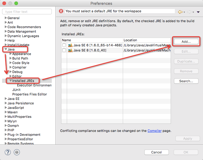 8.從左側欄選擇java下面的Installed JREs,然后點擊Add按鈕,我們要為Eclipse配置JDK: