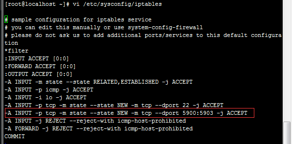 vi /etc/sysconfig/iptables 注釋:可以復制22端口一行,黏貼修改即可,重新啟動防火墻服務 -A INPUT -m state --state NEW -m tcp -p tcp --dport 5900:5903 -j ACCEPT 5900端口是遠程控制軟件VNC的默認服務端口