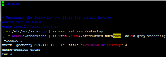 !/bin/sh Uncomment the following two lines for normal desktop: unset SESSION_MANAGER exec /etc/X11/xinit/xinitrc[ -x /etc/vnc/xstartup ] && exec /etc/vnc/xstartup[ -r $HOME/.Xresources ] && xrdb $HOME/.Xresources xsetroot -solid grey #vncconfig -iconic & xterm -geometry 80x24+10+10 -ls -title "$VNCDESKTOP Desktop" &twm & gnome-session &