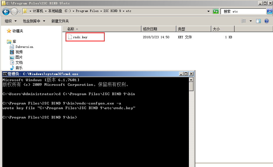 成功安裝后打開DOS窗口,進C:/Program Files/ISC BIND 9/bin目錄,用rndc-config.exe程序生產(chǎn)rndc.key。