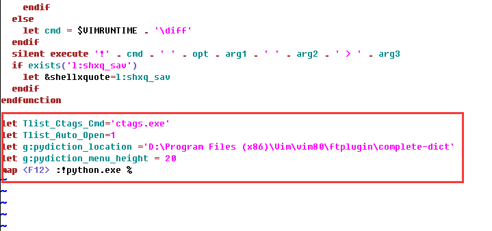 let Tlist_Ctags_Cmd='ctags.exe' (注:如果ctags.exe并沒(méi)有放置在第2步中所說(shuō)的文件中,這里要給出完整的路徑)let Tlist_Auto_Open=1let g:pydiction_location ='D:/Program Files (x86)/Vim/vim80/ftplugin/complete-dict' (注:?jiǎn)我?hào)里是你自己的vim路徑)let g:pydiction_menu_height = 20map <F12>:!python.exe % (這條語(yǔ)句是用來(lái)設(shè)置編譯快捷鍵,程序編寫完成后按F12即可)