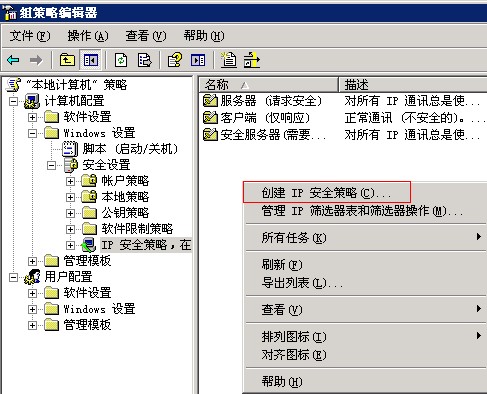 依次打開“本地計算機”策略–計算機配置–Windows設置–安全設置–IP安全策略,在 本地計算機上。