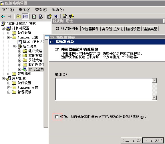 三、給新建的IP篩選器加上篩選器操作在剛才的新規則屬性對話框上點擊篩選器操作選項卡,點擊添加,下一步