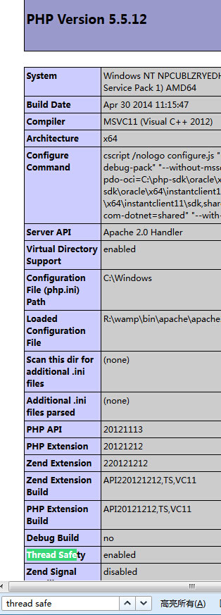 注:ts是指線程安全、nts是指線程不安全,可以在phpinfo中的查找 Thread Safety項,若是enabled則為線程安全。