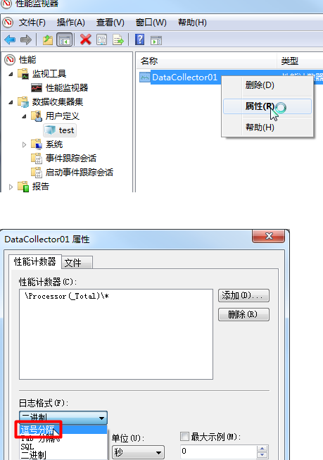 3、選擇用戶定義下的數據收集器集>右鍵屬性>性能計數器,日志格式選擇“逗號分隔”(即csv格式),