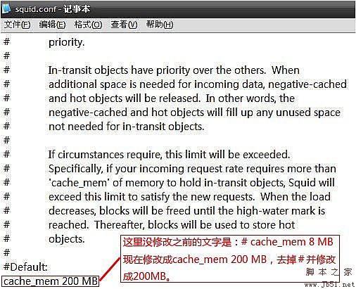 6)找到# cache_mem 8 MB這句刪掉前面的#號將默認的8修改到需要的大小,這里的數(shù)值應(yīng)視具體的機器可用內(nèi)存而定,應(yīng)在內(nèi)存允許的情況下盡量地設(shè)置的大一些以提高代理服務(wù)器性能,但不能讓代理服務(wù)器的緩存大小影響本機器的性能。如下圖操作即可。