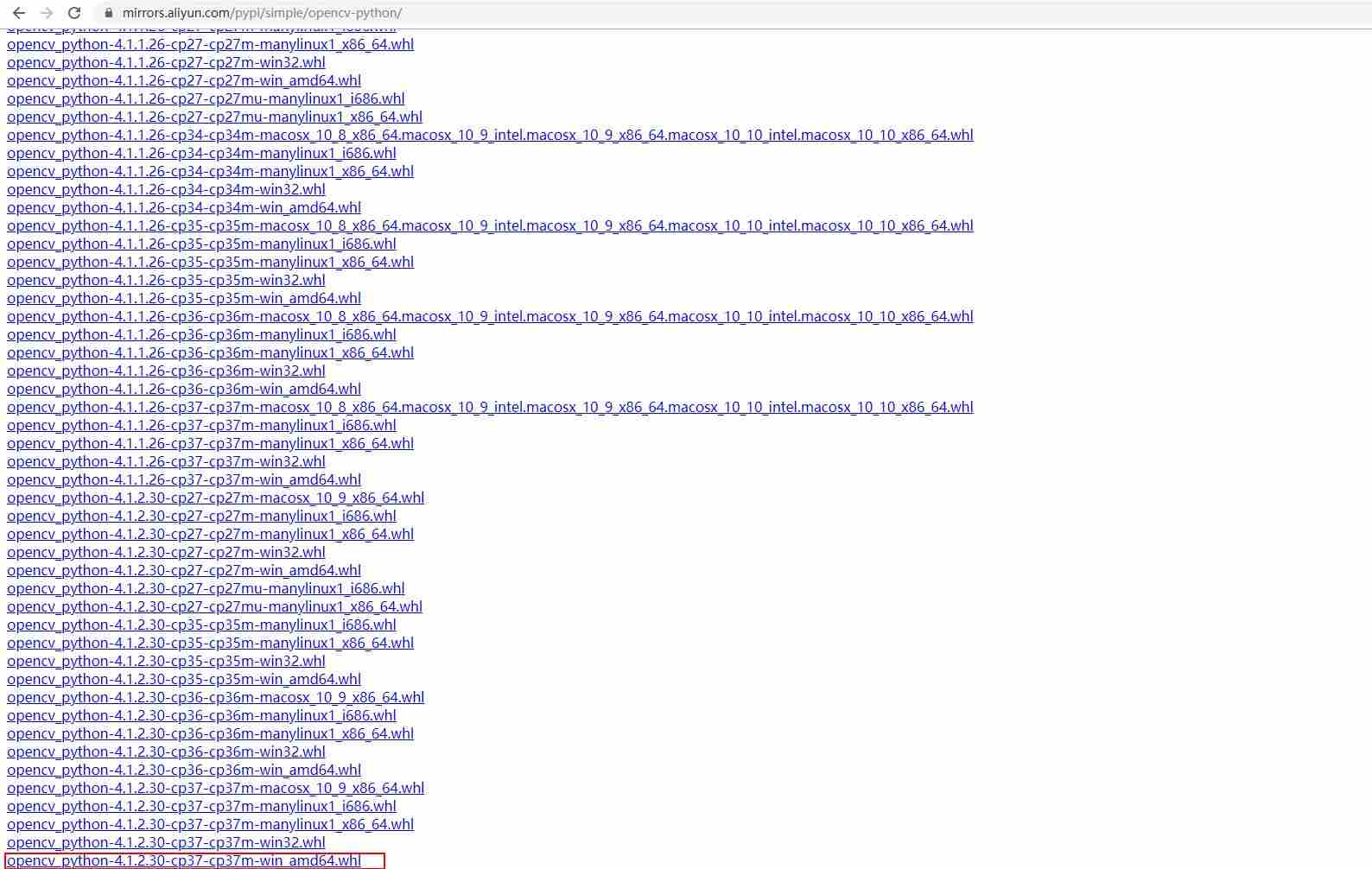 可在阿里云的鏡像倉庫內查看opencv-python目前所支持python版本,cp**代表支持的python版本。