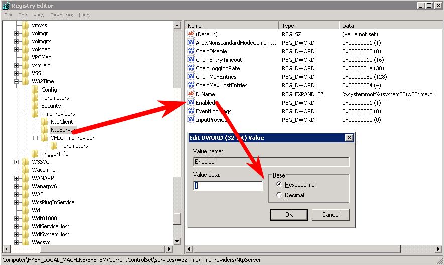 打開注冊表定位到:HKEY_LOCAL_MACHINE/SYSTEM/CurrentControlSet/Services/W32Time/TimeProviders/NtpServer 分支 將enable 值設為十進制1,表示啟用ntp server