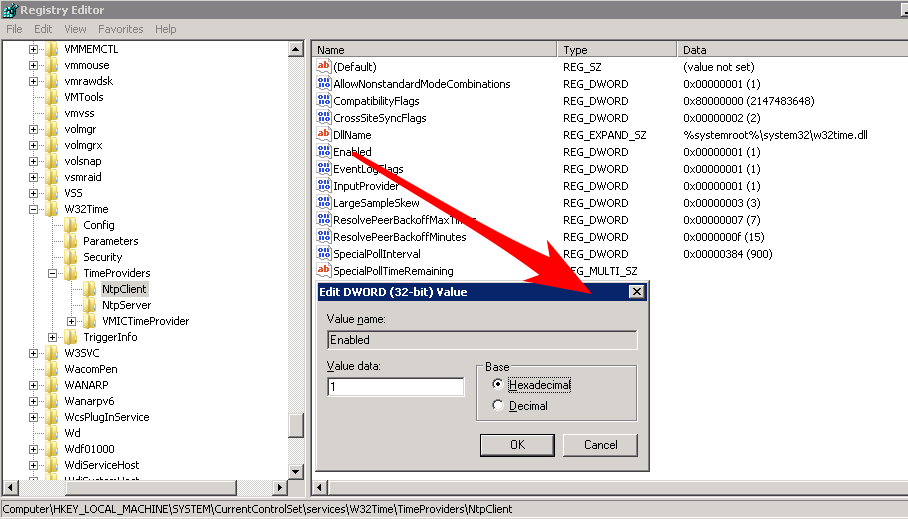 打開注冊表定位到:HKEY_LOCAL_MACHINE/SYSTEM/CurrentControlSet/Services/W32Time/TimeProviders/NtpClient 分支 將enable 值設為十進制1,表示啟用ntp client