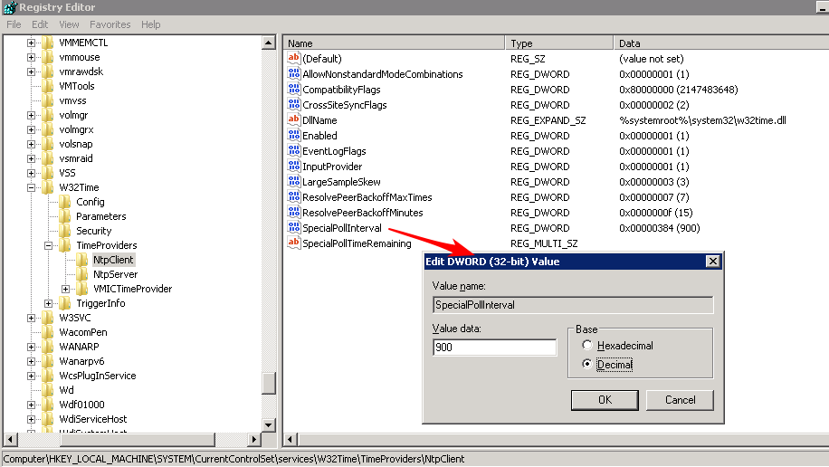 再將SpecialPollInterval的值設為900,這個值表示多長時間和服務器同步一次,單位是秒。