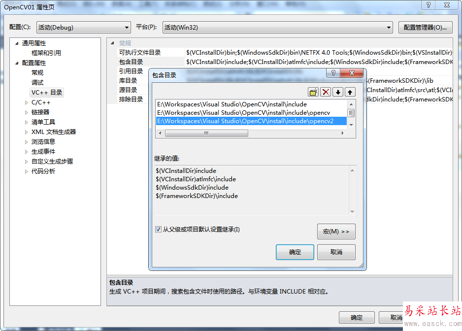2、打開OpenCV01項目屬性,依次選擇“配置屬性”->“VC++目錄”->“包含目錄”,添加相應路徑;