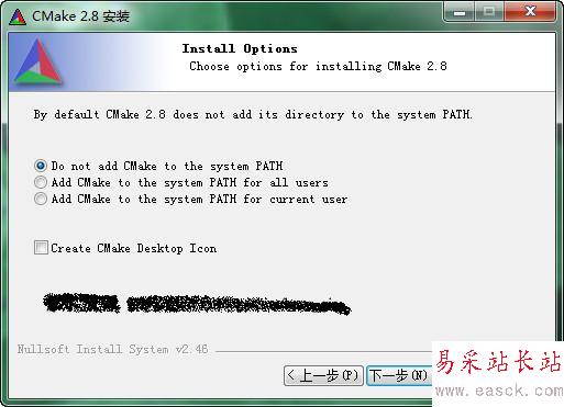從http://www.cmake.org/cmake/resources/software.html上下載WWindows版本安裝包cmake-2.8.10.2-win32-x86.exe文件,雙擊一路默認安裝即可。