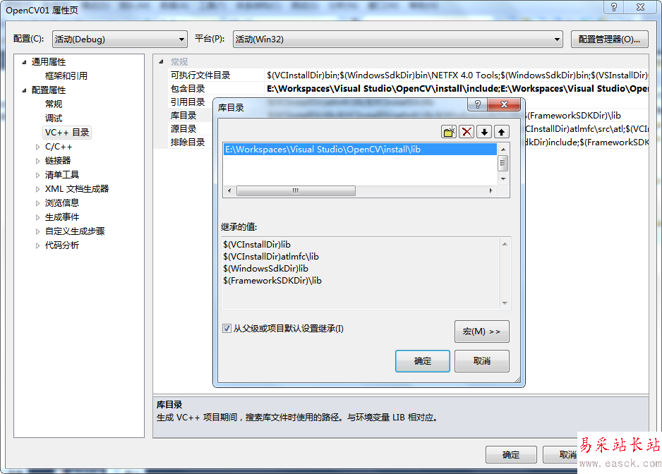 配置include路徑的作用是告訴VS從哪里查找OpenCV的頭文件,配置lib路徑的作用是告訴VS從哪里查找OpenCV的庫文件。