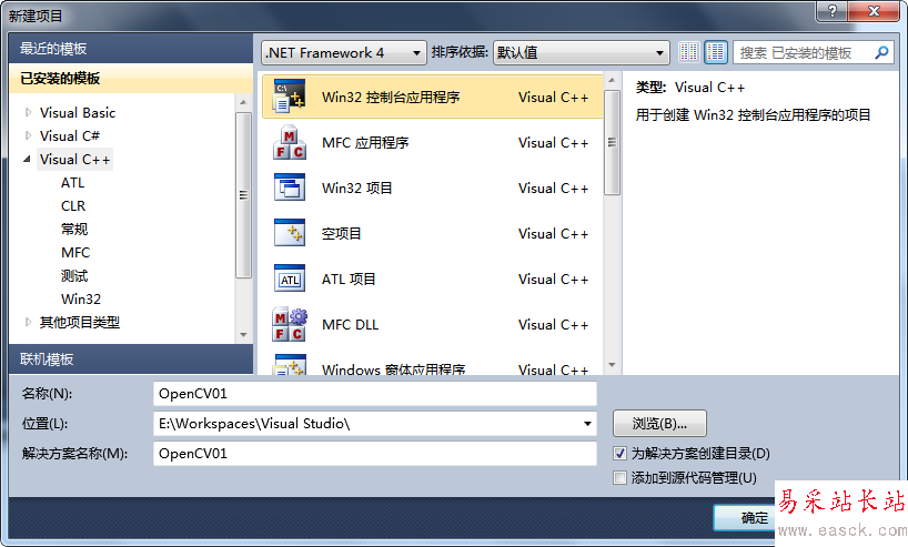 1、啟動VS2010,新建一個Win32控制臺應用程序OpenCV01;