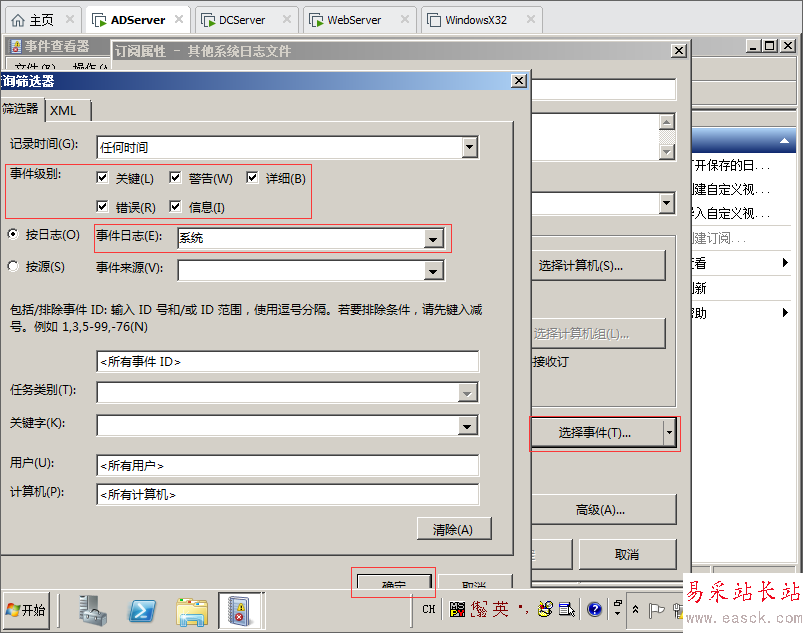 12.點擊選擇事件,事件級別全部勾選,事件日志我們選擇系統(tǒng),點擊確定。