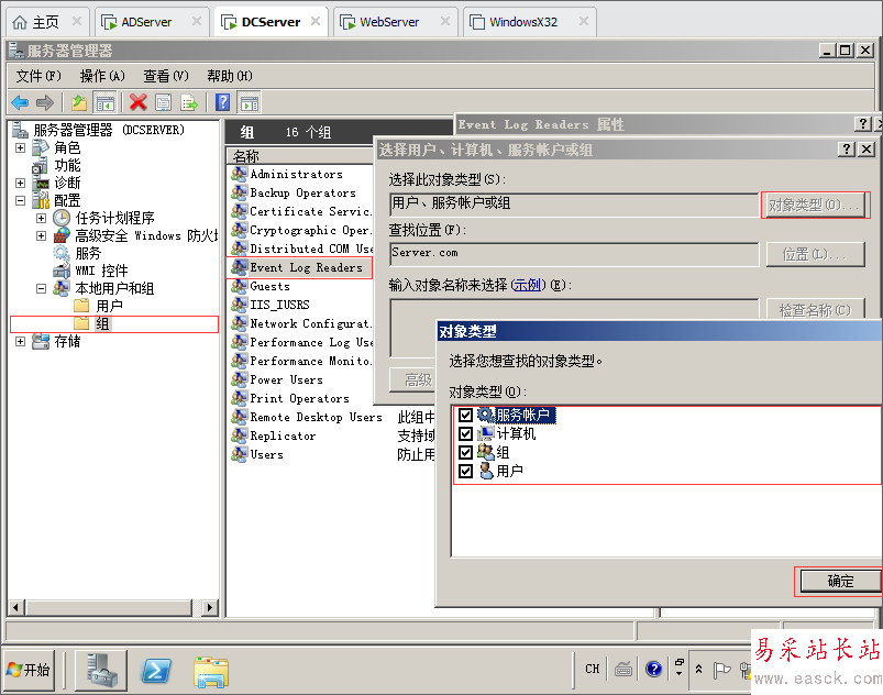 8.打開DCServer服務(wù)器上面的 服務(wù)器管理器找到本地用戶和組然后把ADServer服務(wù)器加入到Event Log Readers日志組里面,點擊添加選擇對象全部勾選計算機,然后輸入對象名稱輸入ADServer然后確定。