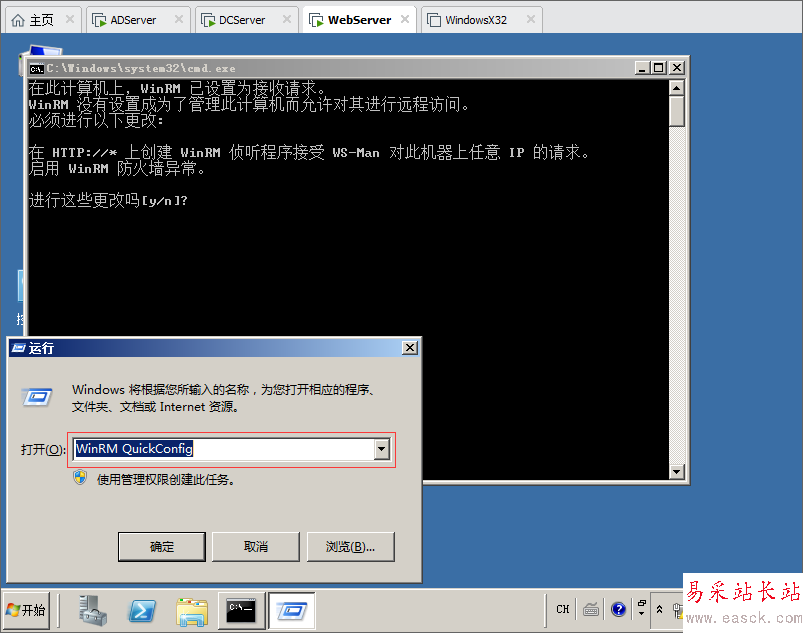 6.訂閱其他計算機上的日志文件,在DCServer服務(wù)器跟WebServer服務(wù)器上面在運行框輸入WinRM QuickConfig命令。