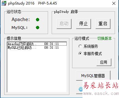 1.4然后就可以點擊phpStudy.exe運行程序了。成功運行結果如下(注意,它是有個開啟服務的過程的,運行狀態的那兩個指示燈是從紅色變到綠色的):