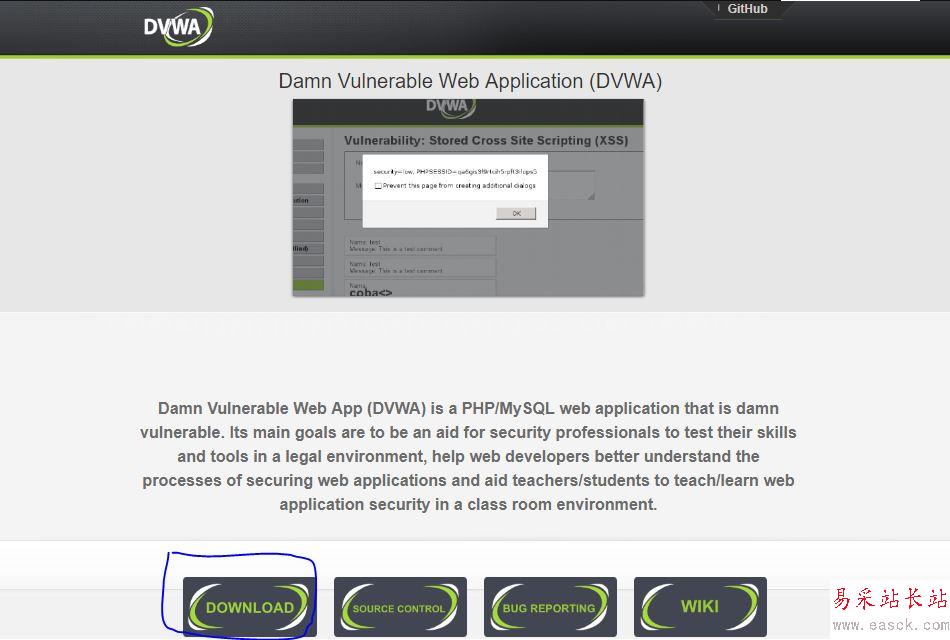 2.1進入dvwa官網,網址為:http://www.dvwa.co.uk/ 頁面拉到最下面,點擊“download” 進行下載。