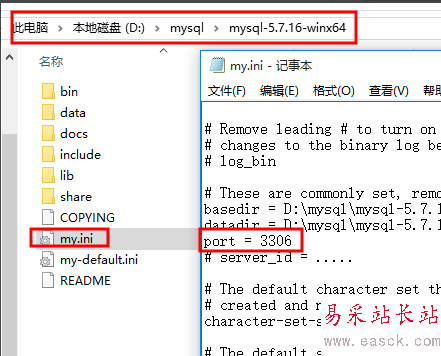 然后我們打開安裝目錄文件夾下的my.ini 配置文件 找到如圖所示的項 修改你想要的端口號 保存(這個也是很簡單的查看當前端口號的方法哦)