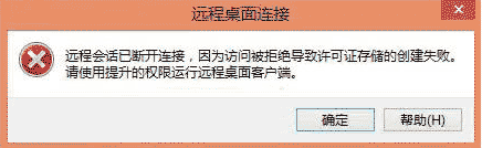 并不能解決問題,之后出現了新的錯誤提示,如第二個圖:“遠程會話已斷開連接,因為訪問被拒絕導致許可證存儲的創建失敗。請使用提升的權限運行遠程桌面客戶端。”