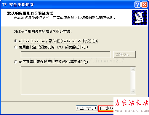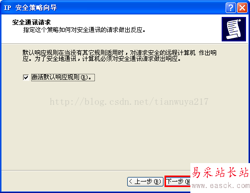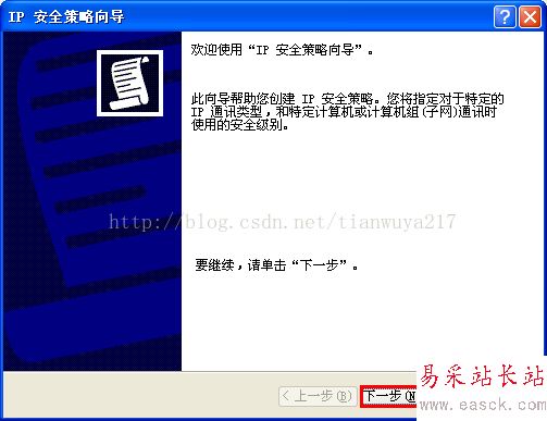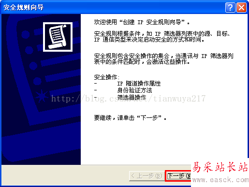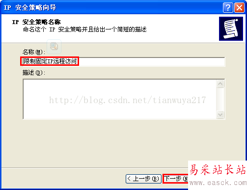 (3) 進(jìn)入設(shè)置向?qū)В涸O(shè)置IP安全策略名稱為“限制固定IP遠(yuǎn)程訪問”——在警告提示框選擇“是”,其它均保持默認(rèn),具體參考下圖。