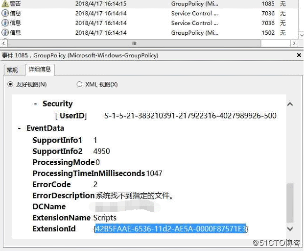 組策略結果集和相應時間點的事件日志中發現了如下報錯: