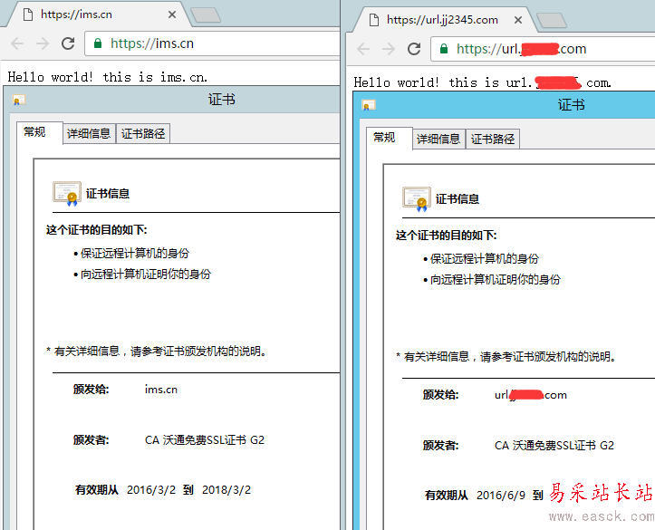 在瀏覽器中分別https訪問這兩個域名,驗證效果:
